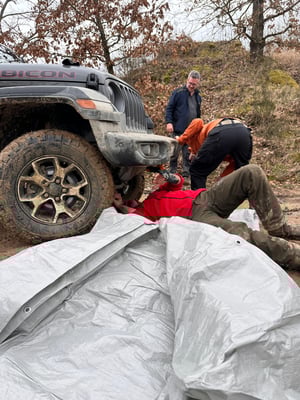 Trotz aller Vorsicht kann es zu Blessuren am Auto kommen. Auch hier zeigt sich David Balliet fachkundig und einfallsreich. Dem armen Jeep Wrangler Rubicon konnte geholfen werden. Das Fahrzeug konnte auf eigener Achse nach Hause fahren.